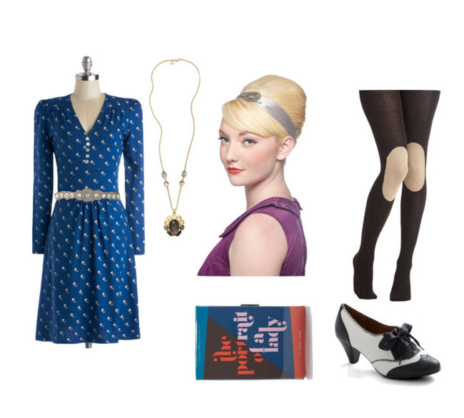 Fukiko sticks to conservative dresses but still avoids being too frumpy. The blue dress in the set would be short for Fukiko's character but paired with thick knee-patch tights it still covers enough skin to get a nod. Its long sleeves and diminutive print would be right up her alley and coupled with a silver belt, the dress is still informal enough for every day wear, too. Combine a silver headband, sensible saddle shoe-style heels and "The Portrait of a Lady" clutch, and you're ready for high society.