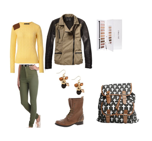 Kaoru lives up to her title with an androgynous look that leans masculine without being too hard. She's usually depicted in green pants and yellow top. This set stays true to her character with high-waisted olive green pants and cable-knit sweater with leather elements. The look gets snazzed up with a military-meets-biker women's jacket and ankle high boots. The earrings connect to the character's nickname by including gold crown charms.