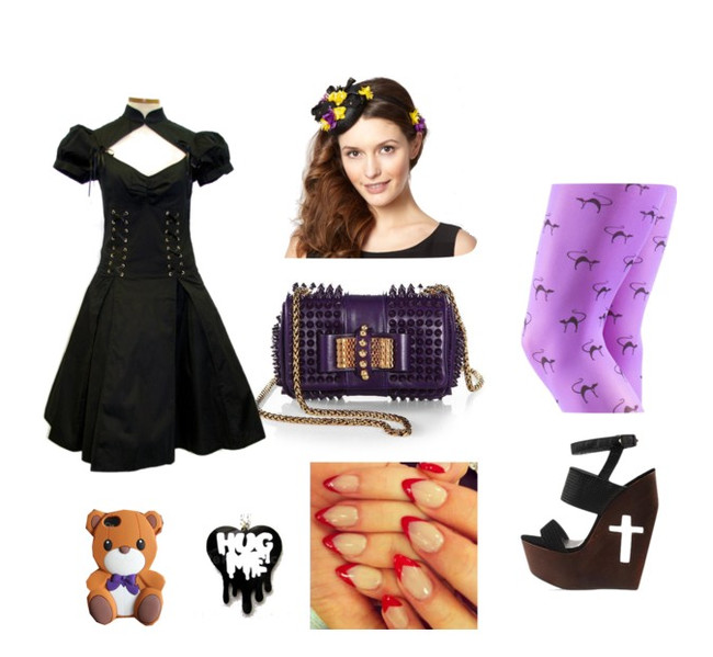 Playing off of Mariko's demure gothness, the set pairs a black lolita dress with Mariko's favorite color: purple. The character's childlike side is shown in the accessories, including a teddybear phone case and fascinator hat. The "Hug Me" necklace is where her creepy side and cute sides meet together. The red nails are a throwback to the series where Mariko always has one thumbnail secretly painted red; make-up and manicures are against school rules.