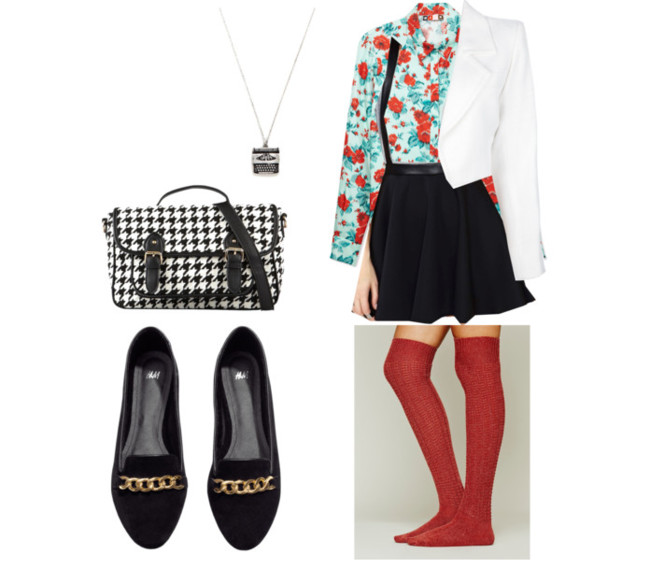 For this set, we decided to take a white blazer and blend it with feminine elements, like a floral print blouse. A set of pants would of taken the outfit too mature for Nanako, so a suspender skirt adds youth to the outfit. The houndstooth satchel is a classy choice for all her school books. Last, but not least, where would Nanako be without a way to write to her brother? In this case, the we've chosen a nod to the character via a typewriter necklace.