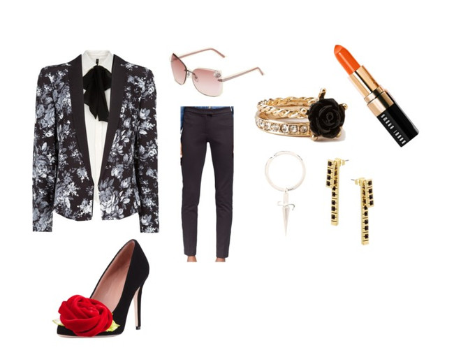 Rei's color palette is mostly monotone with the exception of roses she occasionally receives from fans. Her fancy 'uniform' of sorts recreated with a pair of modern tuxedo pants, a floral blazer, and white blouse. The outfit gets a bit more feminine with a pair of rose heels. Her piano is represented by a pair of piano-key earrings, but we forewent including an actual dagger and opted for a ring instead.