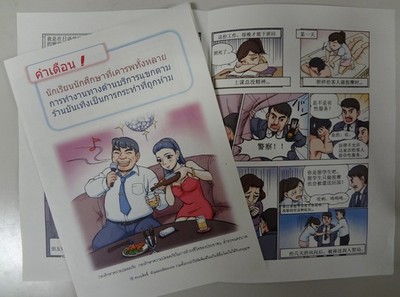 The Tokyo Metropolitan Police Department (MPD) is distributing some 50,000 manga pamphlets printed in Japanese, Chinese, and Thai in the hopes of putting a stop to illegal work by foreign students. Some foreign students come to Japan to study and take part-time jobs at adult entertainment facilities, like massage parlors and "snack bars." These jobs are considered illegal by the Immigration Control Law, meaning the work itself is legal in Tokyo but the jobs cannot be filled by non-native workers. It falls outside the scope of activities permitted by student visa holders.