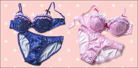 Each 3,980-yen (US$40) Sailor Moon Patterned Bra Set comes with a matching brassiere and panties decorated with tiny Sailor Moon motifs. They come in navy or pink, and the center of each brassiere has a star charm bell.