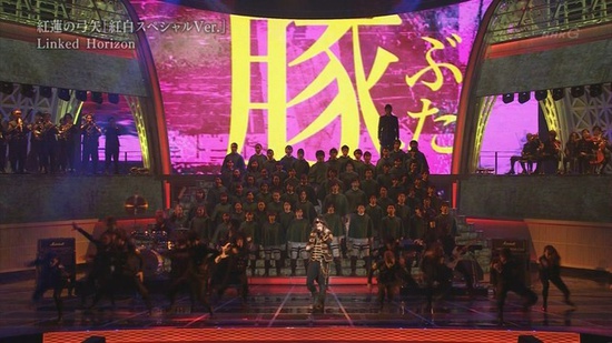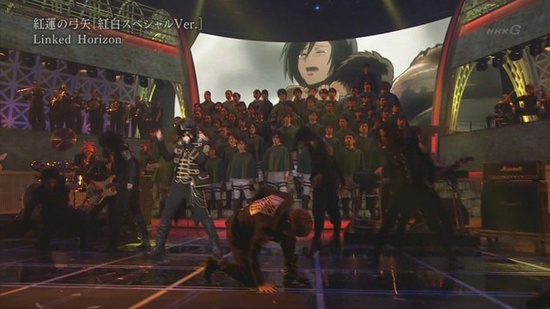 A group of singers dressed in the Attack on Titan anime's Survey Corps uniforms performed the choral portions of the song “Guren no Yumiya (Kōhaku Special Ver.)” with Linked Horizon.