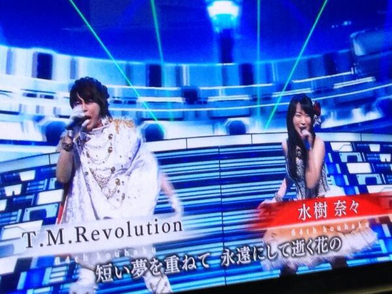 Nana Mizuki and T.M. Revolution also performed a combined version of the two Valvrave the Liberator opening themes, "Preserved Rose" and "Kakumeiki Dualism" (Revolutionary Dualism). Both singers wore outfits that changed from red to white during the performance.