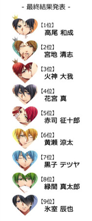 To decide what characters would be included in the anthology, Fusion Products put out a survey asking readers which of the boys from Kuroko's Basketball would make the best boyfriend. The results were as follows: