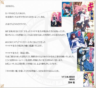 A letter was written by MF Bunko J editor-in-chief Sou Yurugi to preface the memorial; it ended by saying that everyone at the publishing house deeply misses the beloved author and wishes to offer up their sincerest gratitude for Yamaguchi's gift of his work.