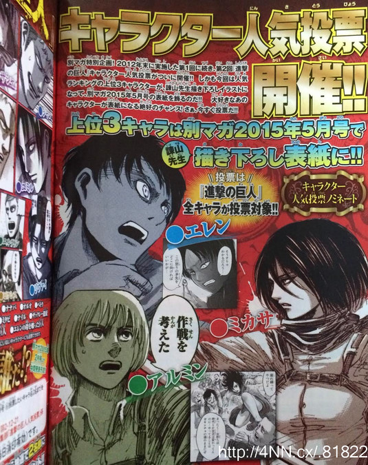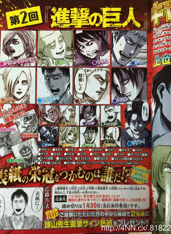 The magazine is also soliciting fan input for its annual Attack on Titan character popularity poll. The winners will be announced next month in Bessatsu's February issue, and Hajime Isayama, the manga's artist, will draw the top three characters for the cover of the magazine's May edition. Participants are free to choose any character they wish, including from among the Titans, although the magazine's December issue provides this helpful overview.