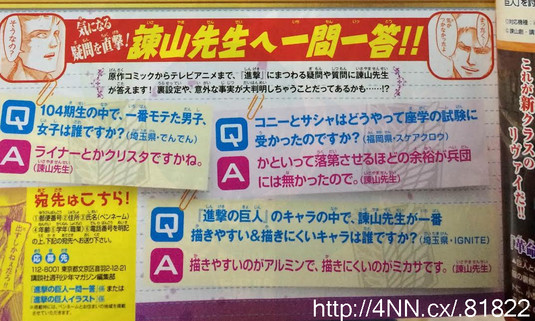In the December issue of Bessatsu Shōnen Magazine, which carries Attack on Titan, series creator Hajime Isayama answered a few reader-submitted questions, including which corp member is the most popular.