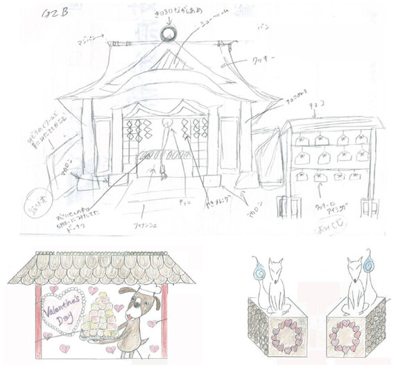 The candy shrine will be built from February 7 to 9, with a dedication ceremony scheduled for the 9th at 2 PM. The shrine will stay up until after Valentine's Day. The Inari Kon Kon badges, ema, o-mikuji and cookies will be available starting on February 11.