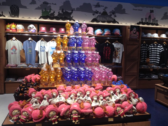 Water bottles, hats, shirts, and Chopper plush toys.
