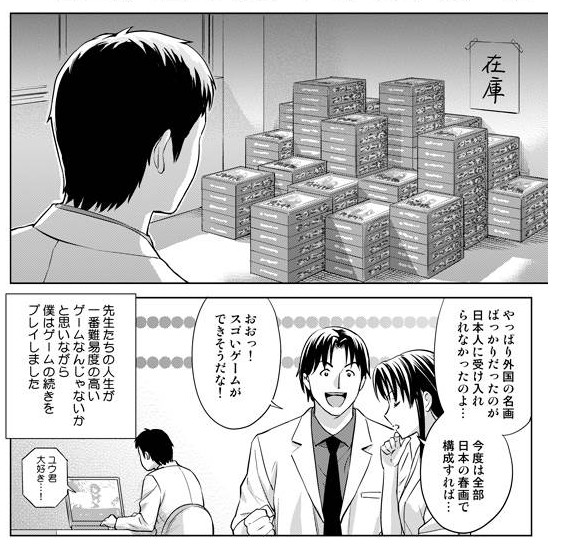 The idea came when Yū's coworkers catch him playing a dating sim at work and start speculating on why the characters' eyes are so big. Although they think using such widely recognized works of art would broaden the audience for their game, they are mistaken. Piles of games sit in their storage room unsold. The developer speculates that focusing on foreign art was the problem and decides to make another game using shunga (Japanese erotic art from the Tokugawa era).