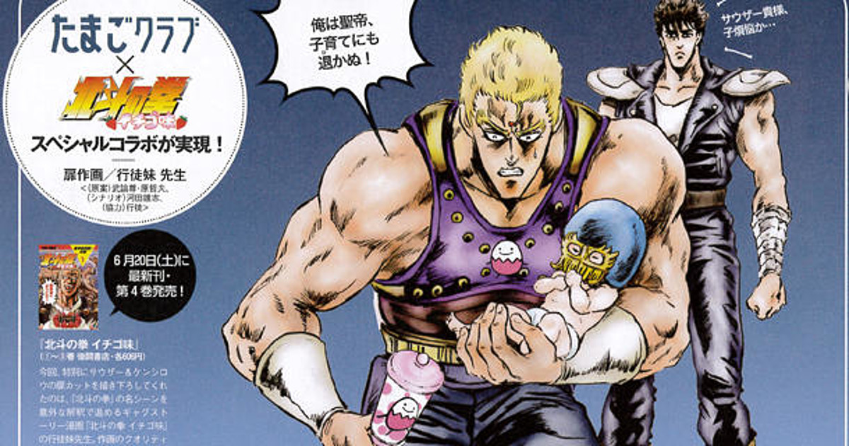 To celebrate Father's Day, Strawberry Flavored Fist of the North Star, a parody manga of the classic action series Fist of the North Star, is appearing on the cover of two maternity magazines, Tamago Club and Hiyoko Club, in their June issues. On both, Emperor Souther tries his hand at child-rearing. They are both drawn by Imōto Yukito, the artist of Strawberry Flavored Fist of the North Star. Father's Day in Japan falls on June 21.