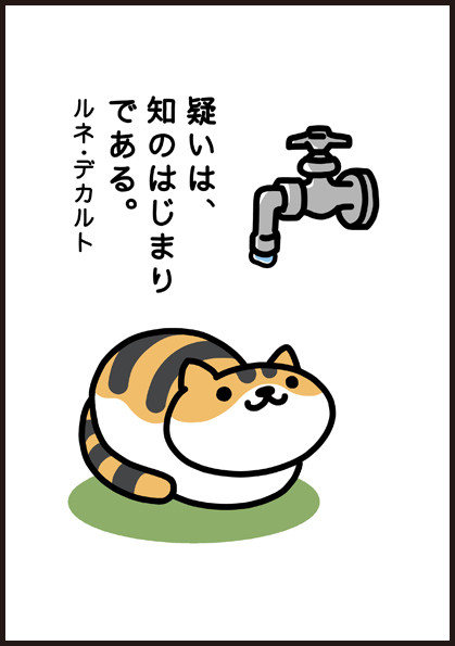 It depicts one cat contemplating over a dripping fountain, with its third panel accompanied by a quote by French philosopher René Descartes: "Doubt is the origin of wisdom."