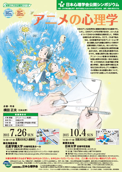 A symposium examining anime from a psychological perspective, Anime no Shinrigaku ("Anime Psychology"), will be held on July 26 at Sapporo's Hokusei Gakuen University, with a follow-up on October 4 at Tokyo's Nihon University. Organized by Masao Yokota, a clinical psychologist and anime scholar at Nihon University, it will include Sunao Katabuchi (the director of Black Lagoon and Mai Mai Miracle) and psychologists Hirokazu Yoshimura and Kō Nakamura. It is sponsored by the Japan Psychological Association.