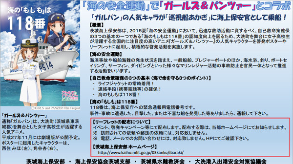 Characters from the popular tank-for-sport anime are being featured on special Japanese Coast Guard safety leaflets. Oarai Girls High School students Miho Nishizumi and Anzu Kadotani are presented in full uniform to offer tips on how to remain safe on the sea during the summer. Anyone who offers their mailing information to this website will receive the special pamphlets. Otherwise, they may be picked up at Oarai Port on July 11 and 12 during an informational event.
