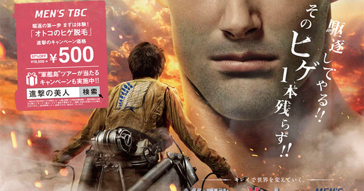 The live-action film adaptation of Attack on Titan is collaborating with beauty treatment company Aesthetic TBC in the new "Attack on Beauty" campaign. They, along with Japanese make-up company épiler are now offering a body hair loss service at special prices. Furthermore, anyone who signs up for the service becomes eligible to win one of five pairs of tickets to tour Gunkanjima (Battleship Island), the on-set location for the films. Participants may also have the chance to win specialty goods from any TBC salon.