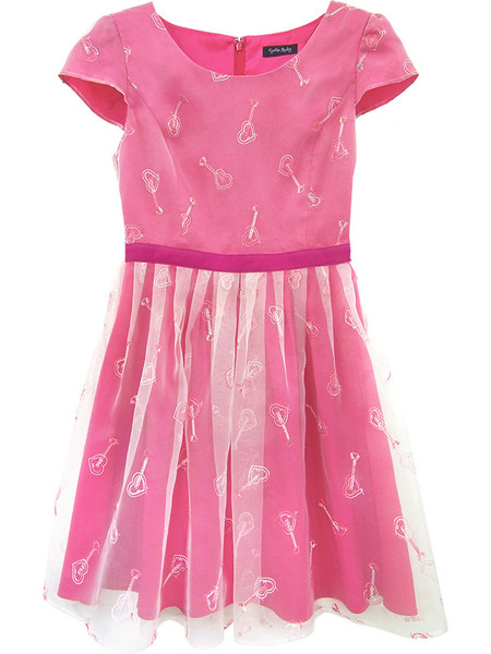 Cyan, the shy-but-talented guitar/vocalist of the group, can be seen sporting a lovely pink one-piece dress featuring a frilly skirt.