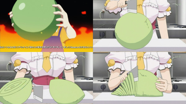 The "Quality Cabbage" is seen being held by protagonist Kimihito moments before being torn to shreds. The meme originated from the 2006 sci-fi romance anime, Yoake Mae yori Ruriiro na, which showed off a spherical cabbage being sliced up by one of the characters.