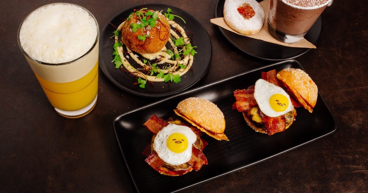 A multi-course menu featuring egg-centric dishes costs US$39 and includes a crispy blanket egg, spicy pork belly sausage with a soy sauce egg, and miso aioli as the appetizer. This is followed by the main course: sunny-fried quail egg sliders, two types of cheese, ketchup leather, and hot sauce. The meal ends with chocolate custard pudding, an apricot thumbprint cookie and an orange-ginger egg cream soda for dessert. Gudetama stares back, disinterested, on top of the pudding and sliders.