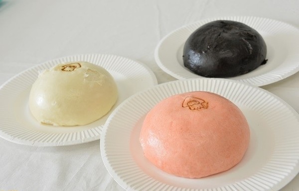 Three different kinds of manjū (Chinese-style steamed buns): squid cartilage, tomato-olive oil-basil-squid-shrimp-and-cheese, and "spicy Chinese-style" with a squid-ink bun (810 yen/$6.57)