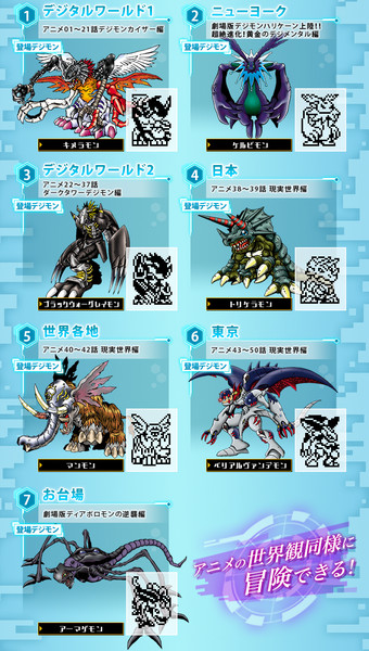 The game map has been revamped to better reflect the world of the TV series. Seven different settings correspond to the anime's story progression: the Digital World (from Episodes 1 - 21), New York (from Digimon: The Golden Digimentals), the Digital World again (from Episodes 22 - 37), Japan (Episodes 38 and 39), around the world (Episodes 40 - 42), Tokyo (Episodes 43 - 50) and Odaiba (from Digimon: Diaboromon Strikes Back).