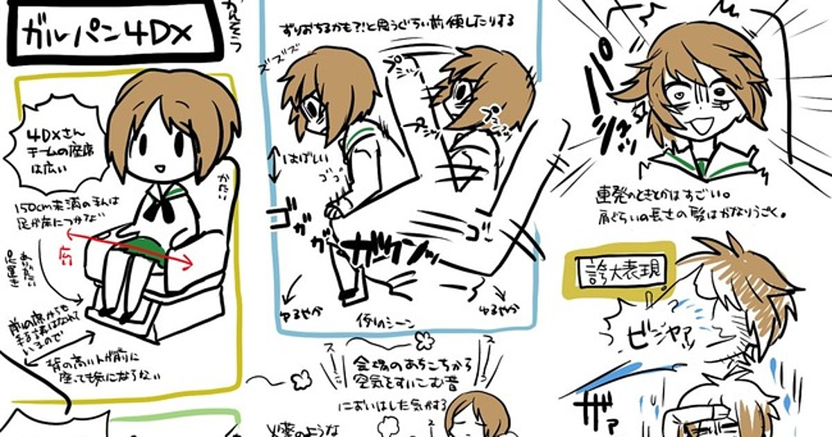 The Cinema Sunshine Heiwajima, in Tokyo's Heiwajima district, is taking 4DX one step further on March 5 with "extreme" screenings, which promise even more aggressive chair movement. It tried the experience out with Mad Max: Fury Road to positive audience reception. Girls und Panzer fans have also enjoyed 4DX screenings, as the webcomics below suggest — although you wouldn't want to bring hot drinks into the theater (even popcorn could get messy), those who wear glasses might not enjoy the mist, and some have complained of head injury. Fans have noted with approval details like the differentiation between diesel engine and gas engine motion.
