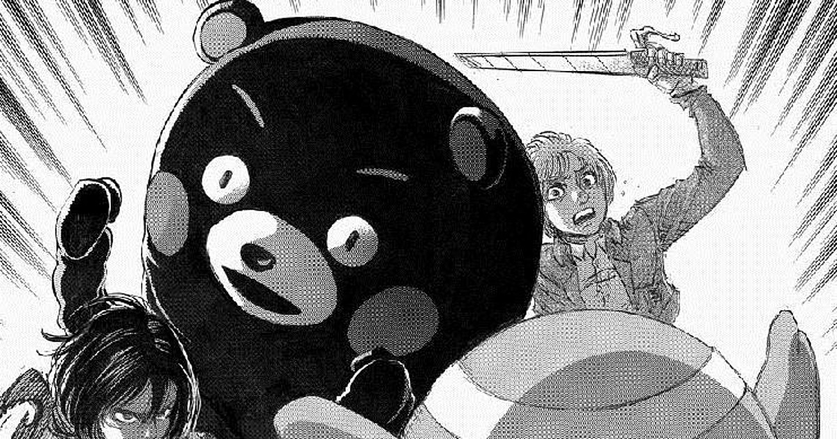 Hajime Isayama (Attack on Titan), another manga artist from the affected region (he is from Hita in Ōita Prefecture), also contributed a drawing as support for the victims. It shows Eren, Mikasa and Armin with Kumamon and Mejiron, Ōita Prefecture's bird mascot, all facing a giant enemy. On his blog, Isayama wrote, "When times have been tough for me, even under very harsh circumstances, I'm reminded of manga heroes who fight for their lives, and I remember that they toughed it out. I drew the illustration with those feelings."