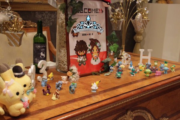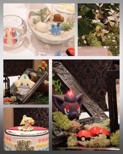 Small terrariums with Pokémon in their natural habitats were at the tables. Guests were greeted by pixel artwork of the bride and groom as game avatars. Meanwhile, a projection screen introduced everyone to "Pokémon HW" (Pokémon Happy Wedding) its trainers.