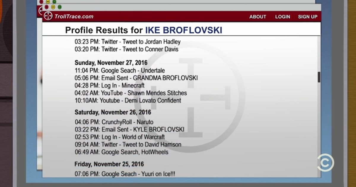 In the latest episode, the character's mom goes online to check Ike's browser history. Vigilant fans noticed entries related to anime as Ike's mom quickly scrolls down the page. Ike apparently checked out Naruto on Crunchyroll on November 26. He also Googled Yuri!!! on Ice the day before.