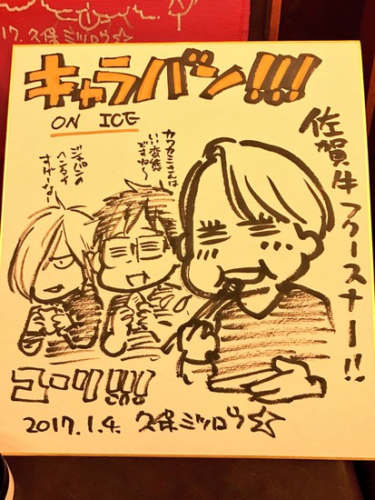 Akinori Kawakami, representative of Karatsu's Michelin-starred steak restaurant Caravan, is also the president of the "Association to Connect Hasetsu and Karatsu." Kawakami posts Yuri!!! on Ice-related messages and images on his Twitter and Facebook accounts. The association apparently brought Kubo and Yamamoto to Caravan, and Kawakami posted images from the visit. He adopted character Jean-Jacques "JJ" Leroy's trademark pose in one of the images.