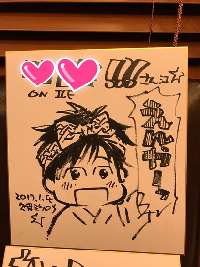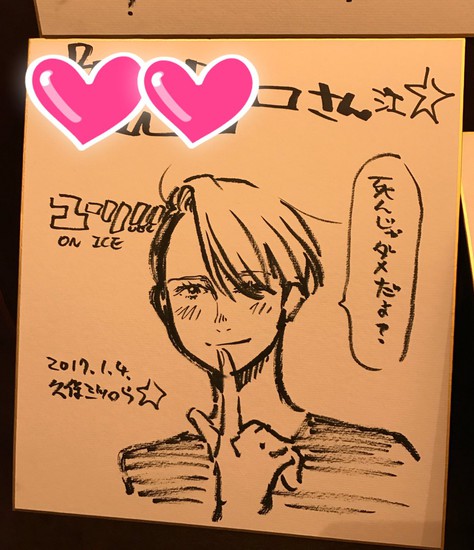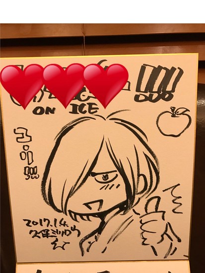 Kubo signed and drew images of Yūri, Victor, and Yuri for people at the restaurant on fancy Japanese paper boards. The restaurant and a fall festival held at Karatsu Shrine in November inspired Kubo's illustrations. The colorful shapes and pictures in the images conceal names. Famous people in Japan often sign and draw pictures on similar paper boards to give to people or places they visit.