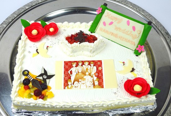The J-Patisserie shop inside the park will offer a "gateau white chocolate" wedding cake for Naruto and Hinata during the event. The cake will feature character images, a scroll, cranes, a shuriken, a kunai, and other decorations. The cake will cost 7,610 yen (about US$68), and people who want to purchase the cake must order ten days in advance.