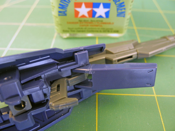 I wanted to highlight a mistake I made while working on one of the guns. I was a little too rough with a delicate piece, and ended up snapping it in half. Luckily, I have Tamiya Cement for situations like this. I used the brush tip to apply a small amount (really, I applied more than I needed to here—it requires very little), and waited 10 minutes for it to dry.
