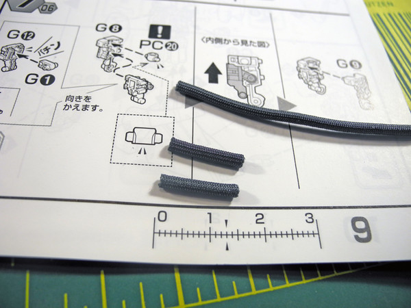 There were a few other peculiarities to this kit. First, some instructions would call for “mesh pipe,” which turned out to be this fabric tube that came with the kit. I would need to look at the ruler on some pages of the instruction booklet, cut it into pieces, and attach them to the kit.