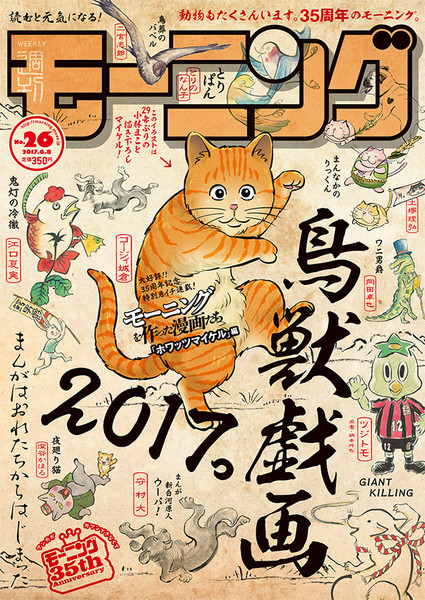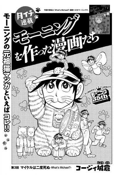 In addition to Kobayashi's illustration, the magazine cover features other Morning manga artists' illustrations of What's Michael?'s characters in the style of Japan's famous Chōjū-giga animal picture scrolls. Kōji's illustrated tribute to What's Michael? appears inside the issue.