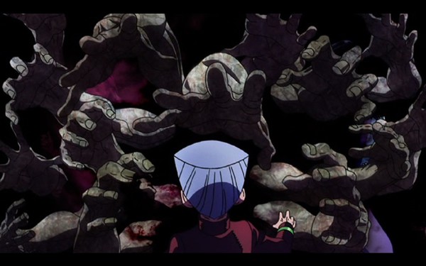 The "no trespassing" sign on the gate of the Nijimura residence after The Hand erases part of it: