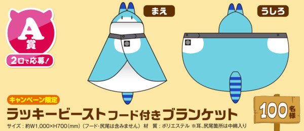People who spend at least 500 yen (about US$5) on collaboration items at Family Mart stores can take pictures of their receipts to submit them online for a chance to win prizes. The A Prizes are 100 Lucky Beast blankets with hoods.