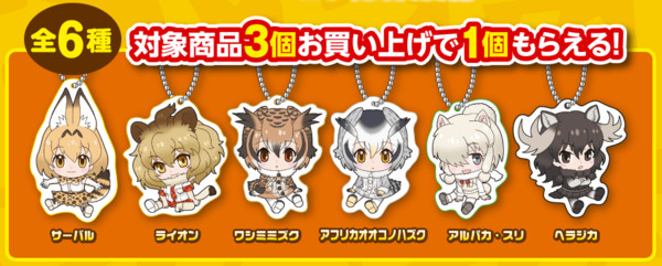 In addition, people who purchase at least three collaboration items will be able to receive one of six "Petanko Kira Kira Charms" during the campaign period while supplies last. The characters who will appear on the charms are Serval, Lion, Eurasian Eagle-Owl, Northern White-faced Owl, Alpaca Suri, and Moose.