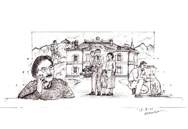 The sand artists are working off of Taniguchi's own creation, Chichi no Koyomi (Father's Calendar) manga. The story takes place in Tottori in the 1950s. A family is devastated by the Great Tottori Fire of 1952, but the family comes to terms with the disaster and breaks free from the bonds holding them back. Taniguchi calls upon his childhood memories of Tottori's streets, the nearby Kyūshōzan mountain, and the local Ōchidani Park to color the manga's backdrops.