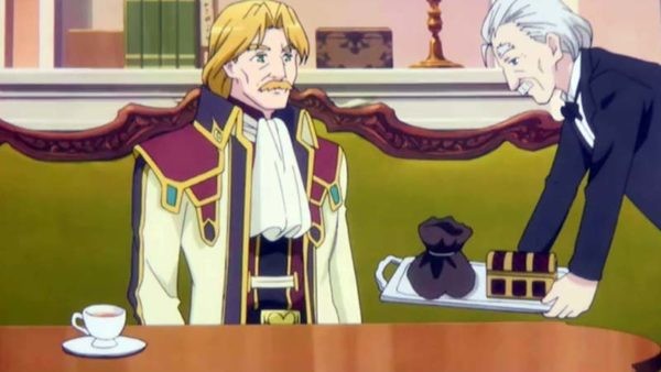 In the image below, Okada thinks the butler appears to have rotated the tray 90 degrees from a normal carrying position before passing it on to the seated man.