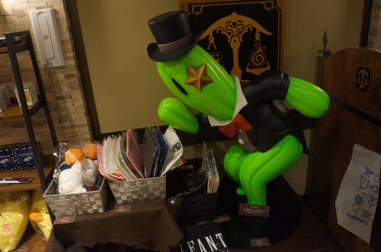 Outside the café is a Sora statue as well as several capsule toy machines. The Kingdom Hearts machines only have a certain number of merchandise loaded in each day, and guests are only allowed to buy five per day. Behind the statue is a take-out area where guests can order drinks to go like bubble tea, juice, or soda. Those who order these drinks still get one of the themed coasters, so those who couldn't get a reservation to the café itself can still get limited café merchandise.