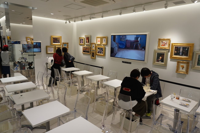 The café isn't the only permanent Square Enix-themed café in Tokyo, however. The Artnia café, a bulbous white building in Shinjuku outside of the company's headquarters, opened in 2012. The building has a small seating area, and a much bigger merchandise area than the other two main cafés. Rows of white cubbies line the walls with merchandise, and in the back "museum" area, figures, T-shirts, and other merchandise surround a water fountain display. No reservations are necessary to visit Artnia, although there is limited seating for the café area. After 5:00 p.m. the area becomes more of a bar and serves alcohol.