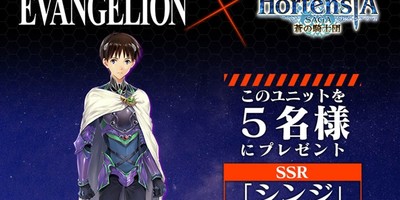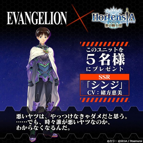 The official Twitter account of Sega's Hortensia Saga smartphone role-playing game announced on Friday that it is holding a Twitter campaign to offer Shinji for the game's collaboration with Evangelion. People who retweet the announcement by November 1 will have a chance to win one of five SSR Shinji character's for the game.