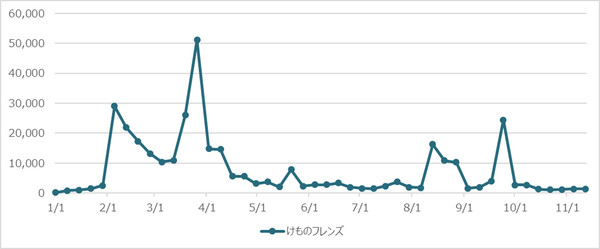 The company posted a graph showing the change in the number of "Kemono Friends" Tweets from January 1 to November 18. The largest spike on the graph appears to mark the premiere of the anime's final episode on March 28. Another notable peak on the chart marks when the anime's director TATSUKI reported on September 25 that, per a notification from publishing and production company Kadokawa, he is no longer working on the Kemono Friends project.