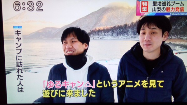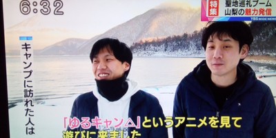Specifically, campers at the Kouan campgrounds on Lake Motosu told the program that the anime inspired them to brave the winter cold and get a new camping experience. A view of Mount Fuji from Lake Motosu appears in the anime's first episode. The news program reported that the number of campers in the area has tripled compared to three years ago, and people are visiting for the purposes of anime pilgrimages. The official website for Yamanashi Prefecture's Yamanashi Tourism Organization also features a section devoted to the anime and its real-world locations.