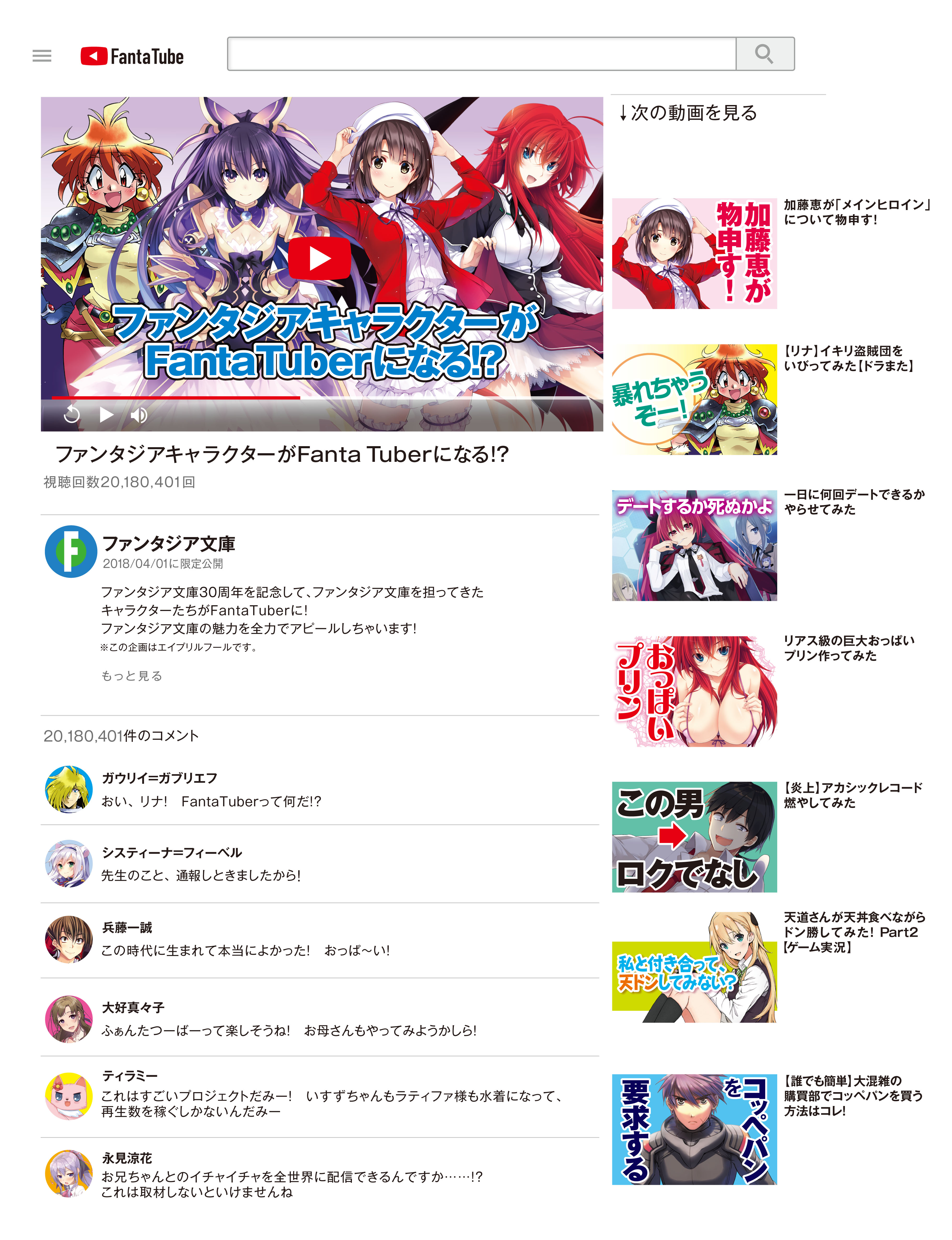 The website posted a fake interface for "FantaTube," where the imprint's novel characters would star as FantaTubers.