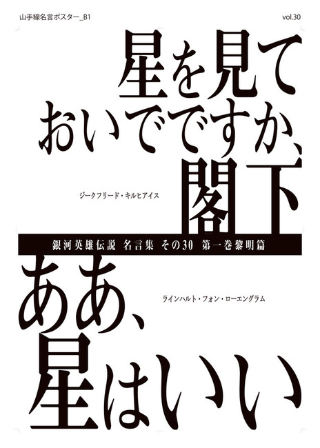 To mark the April 3 debut of The Legend of the Galactic Heroes: Die Neue These, the new anime of Yoshiki Tanaka's epic science fiction novels Legend of the Galactic Heroes, posters with characters' famous sayings are on display at various train stations in Tokyo. The posters went up on Monday, and they will remain on display on platforms at all 29 train stations of JR East's Yamanote Line until April 8.