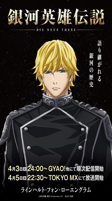 The first season, The Legend of the Galactic Heroes: Die Neue These Kaikō (The New Thesis: Star-Crossed), will air as a 12-episode series. The event screenings of the second "season," The Legend of the Galactic Heroes: Die Neue These Seiran (The New Thesis: Stellar War), will then play in theaters, as three films of four episodes each, in 2019.
