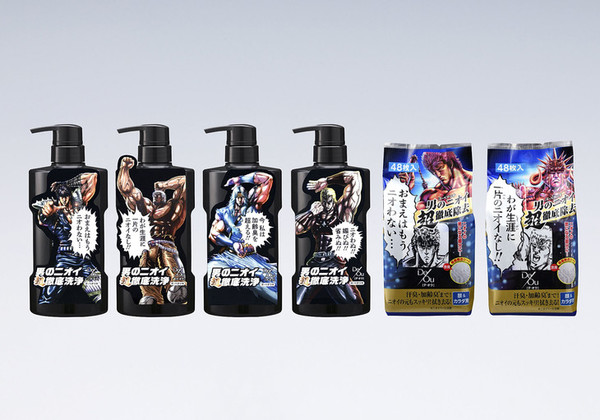 The limited-edition body wash packages feature four different Fist of the North Star characters with quotes. The two varieties of freshening sheet packages show Kenshirō and Raoh in a battle scene, and people can place packages side by side to recreate the scene from the series. The package theming also extends to the back of the packages that show product information and directions.